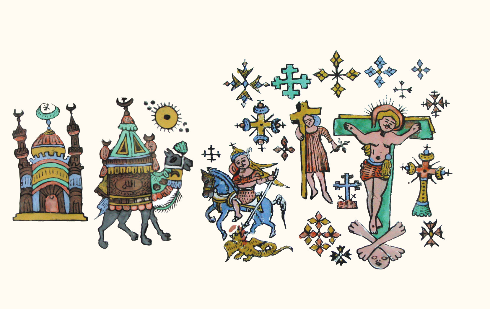 Among Christian motifs, we find figures of Christ as well as representations of St. George and St. Michael. The equal-armed cross, often adorned with fleurons or T-shaped « potencées » (a heraldic shape –similar to a cross) , is one of the most numerous and varied motifs. Copts frequently tattoo themselves, often from childhood, a cross on the wrist or between the thumb and forefinger, a ritual in practice since the eighth century, giving the bearer assurance of being buried in consecrated ground or acting as proof of his faith in the Day of Judgment. Besides the crescent so often present in these geometric and floral compositions, they also figure mosques and dromedaries (camels) driving a caravan of pilgrims from Mecca. These Muslim motifs could therefore attest to a pilgrimage to Mecca, to Medina, or to the grave of a saint.