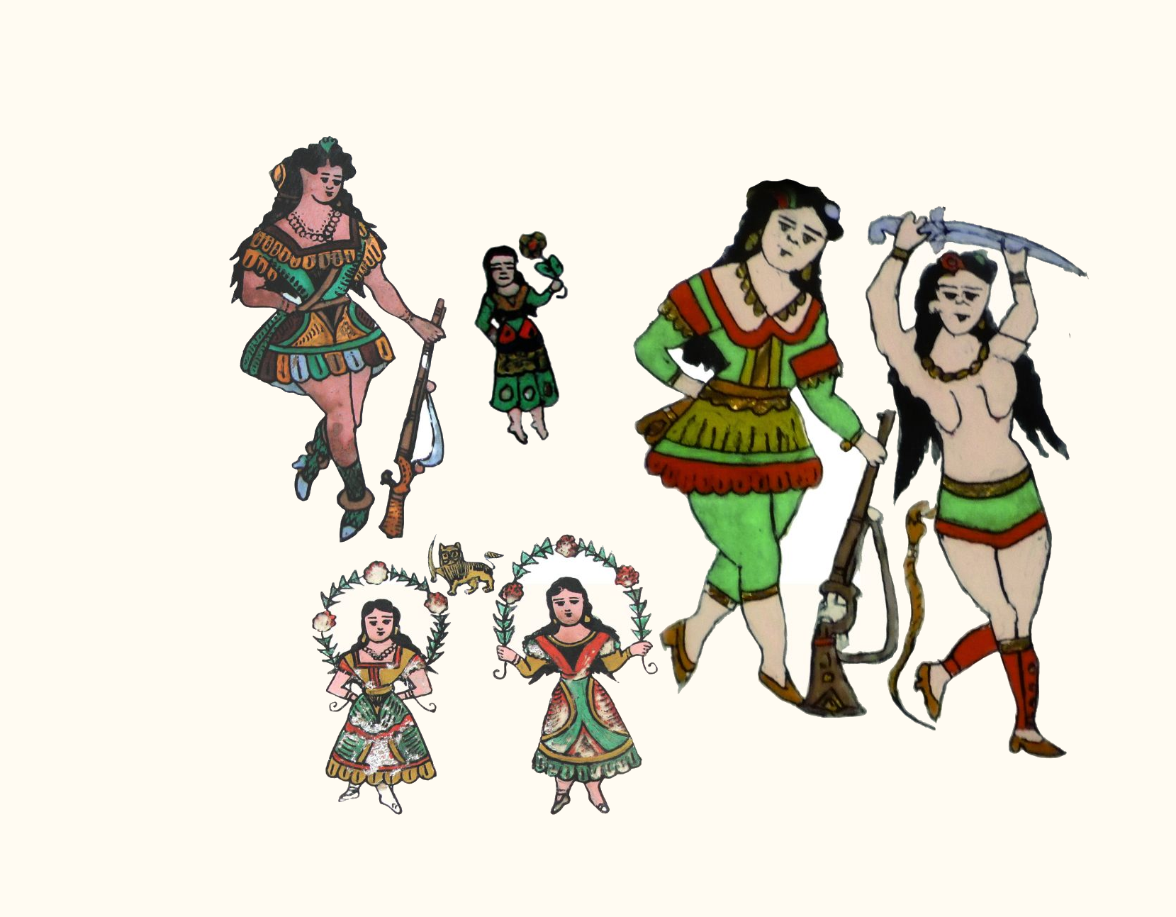 The image of the seductress asserts itself with the poetic and gallant motif of a woman with a jar. There is also an entire series of women given masculine attributes: women with hookahs, women with rifles or brandishing sabers. Featuring equally are courtesans, naked and dancing. The armed women, and even moreso those who hold chained lions, evoke images of Amazons and mortal seduction. Caloyanni asks, among the tattoos worn by women, do the female figures – doll or Amazon – show how they identify themselves?